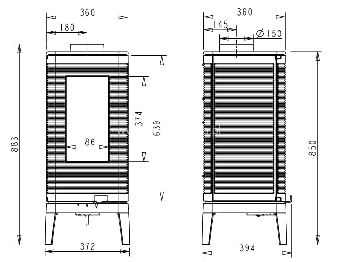 | Przybliżony wymiar szyby / wizji ognia (wys. x szer.) | 374 x 186 mm |